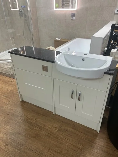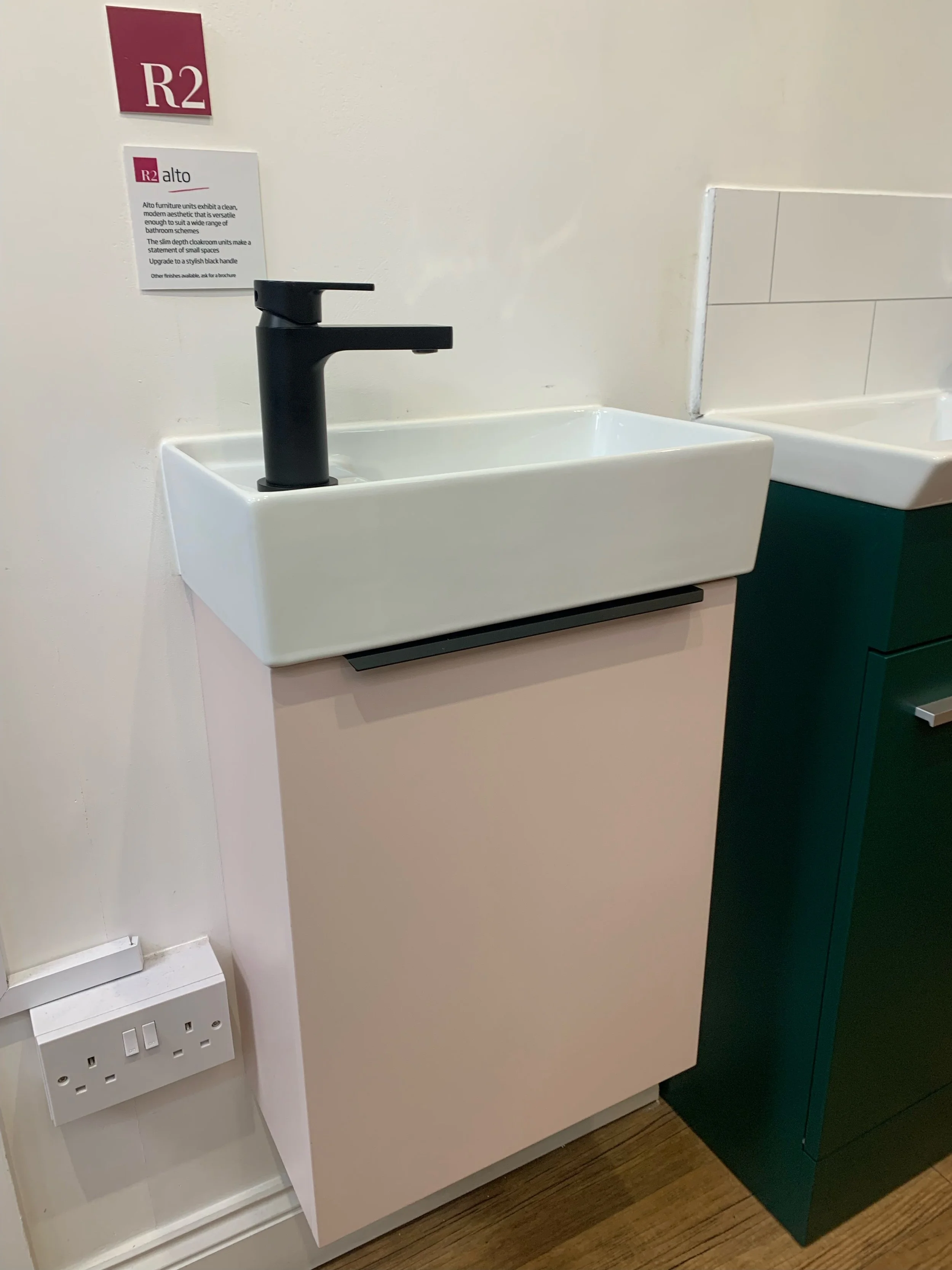 Calypso ‘chiltern mussel’ 600 basin with 600 WC unit, Vegas’ semi recessed basin and Calypso ‘black cluster’ worktop.